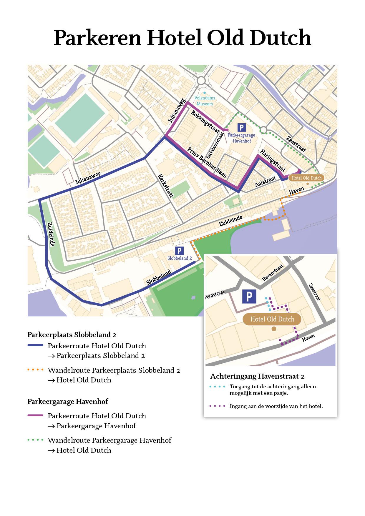 Let op!: u kunt het beste uw GPS-navigatie uitzetten wanneer u Volendam inrijdt. Volg de parkeerborden om bij de parkeermogelijkheden terecht te komen.